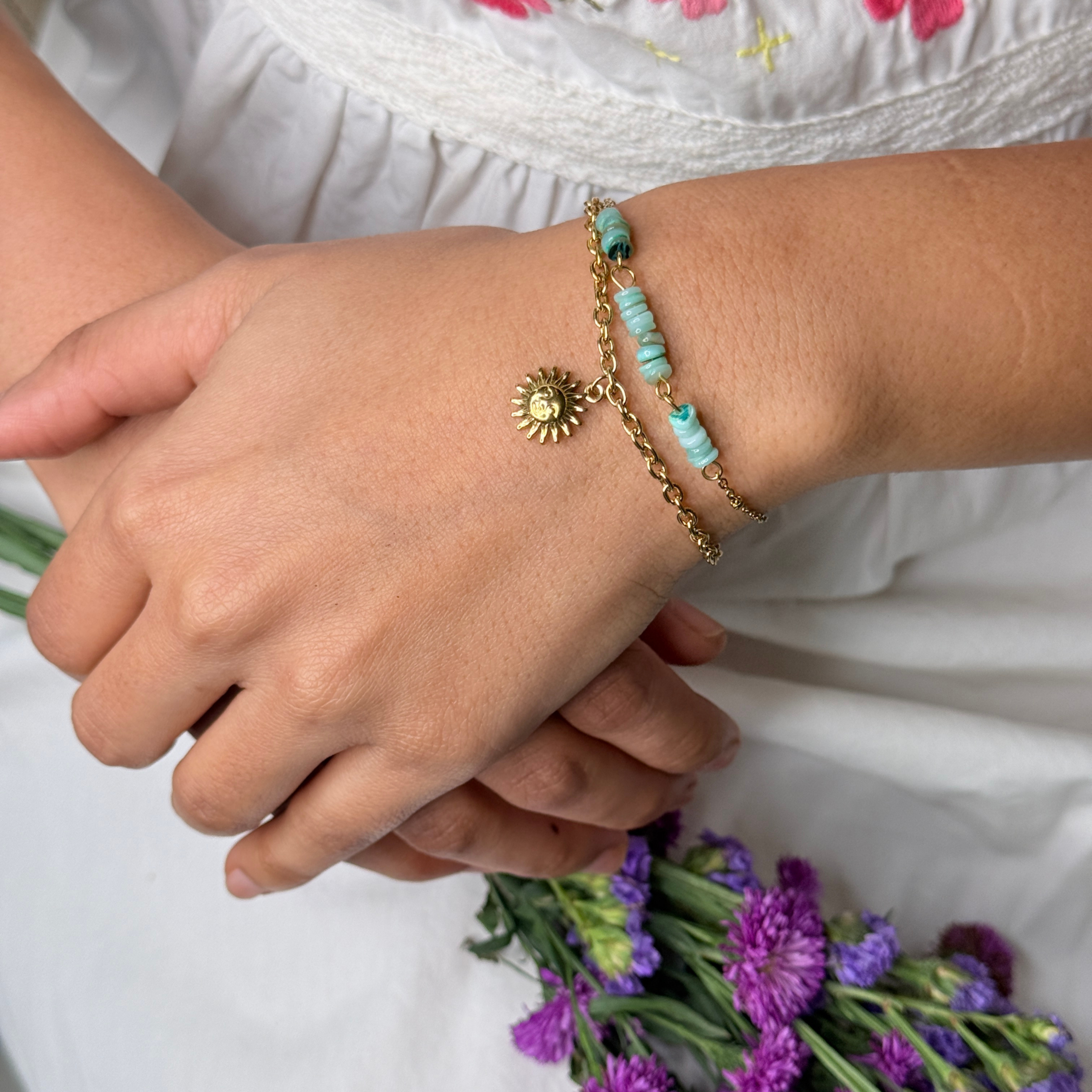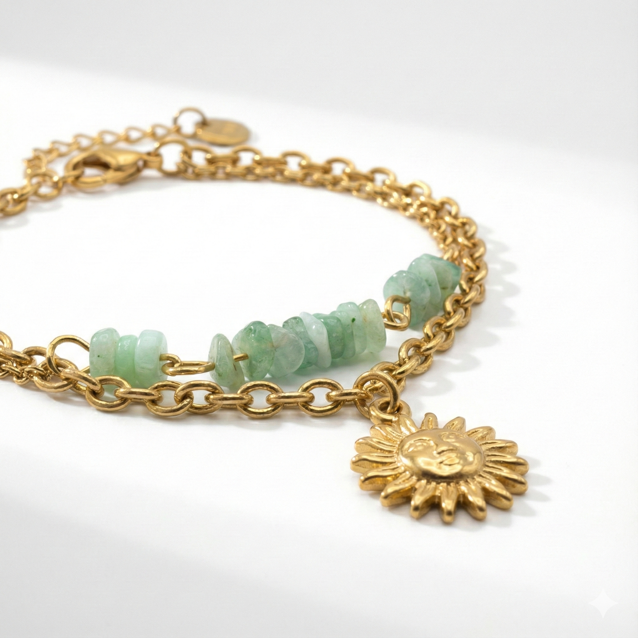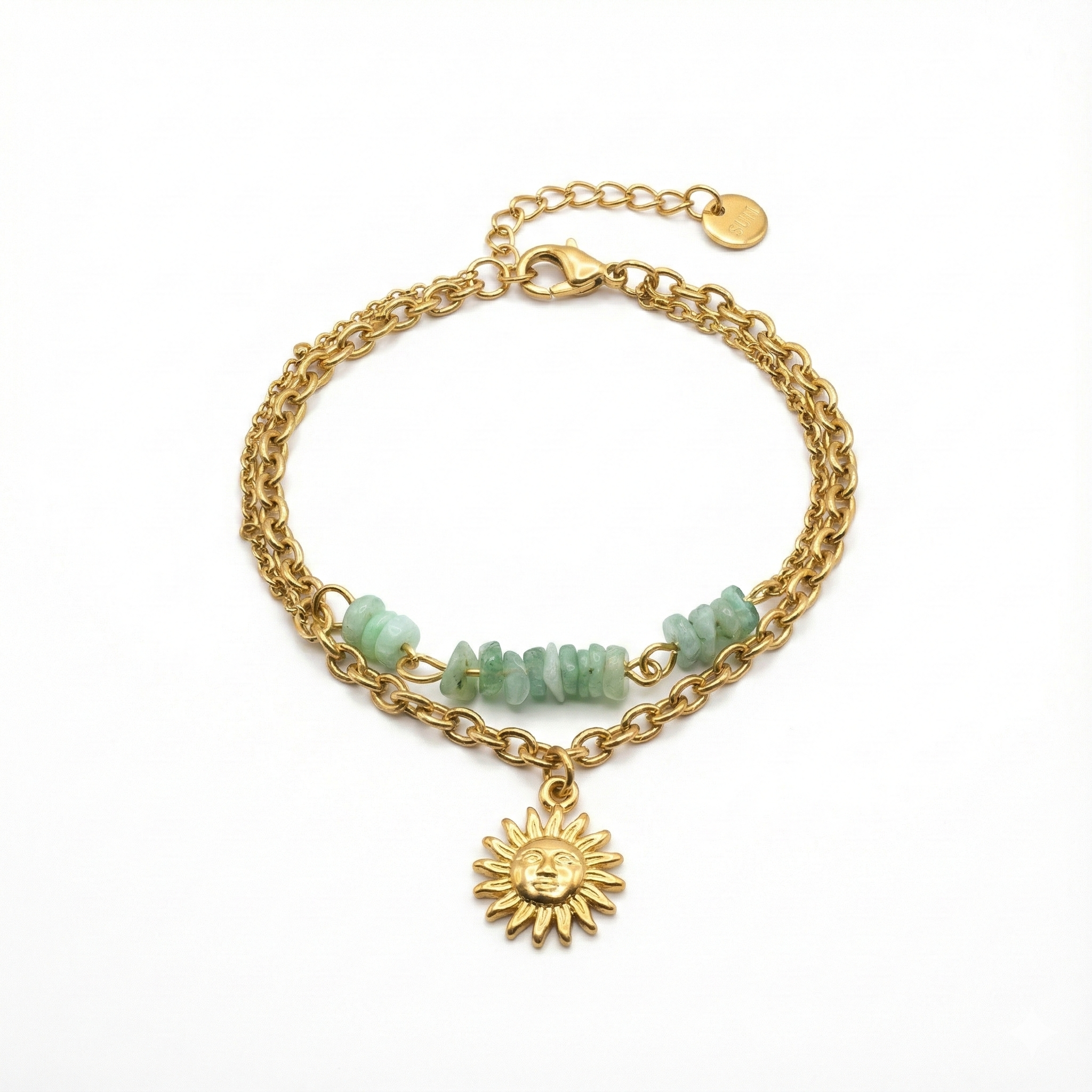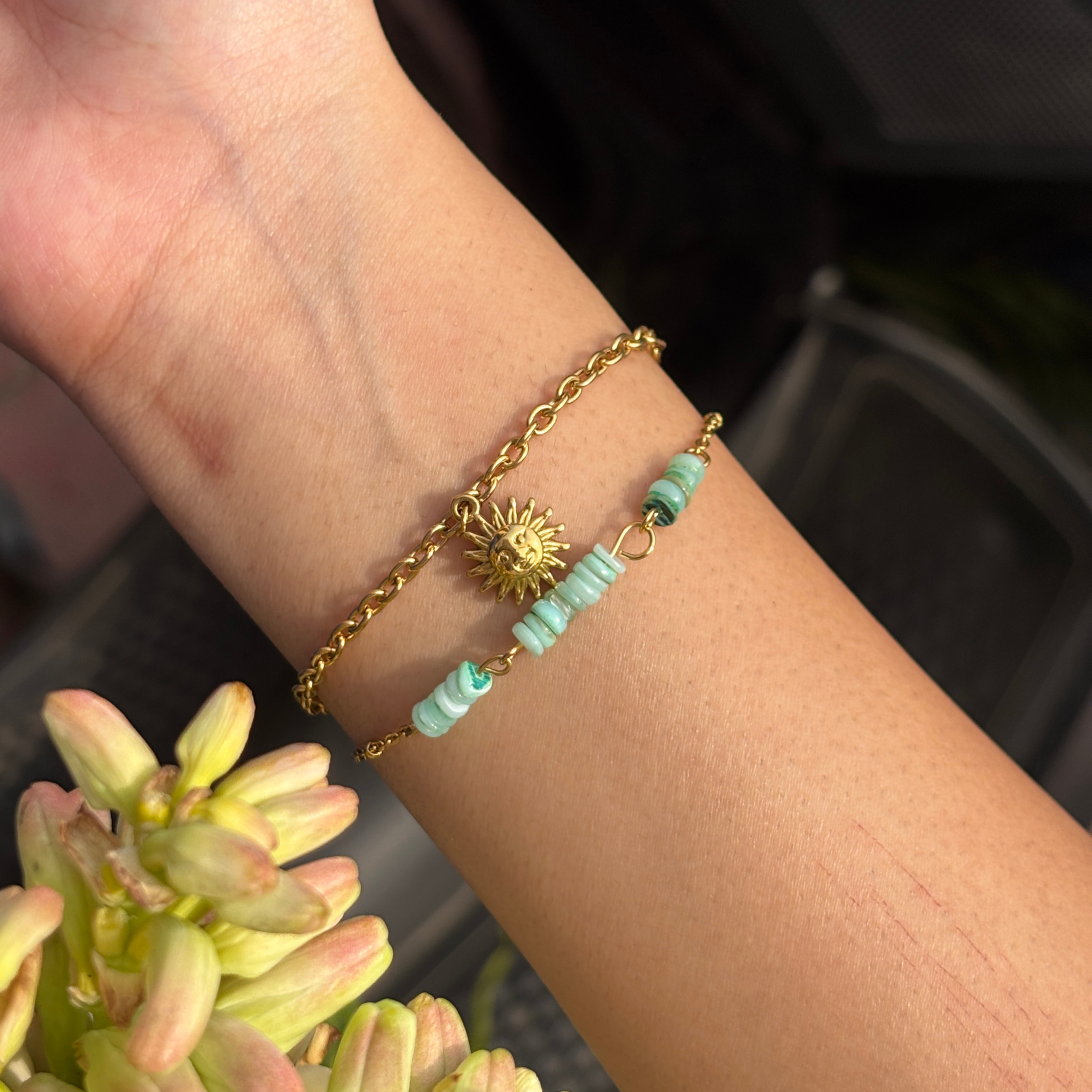 Arká means sun — a symbol of energy. This two-layer bracelet pairs a structured gold chain with natural green beads, finished with a sun charm. Made to represent warmth and balance – a piece you wear for what it stands for.
