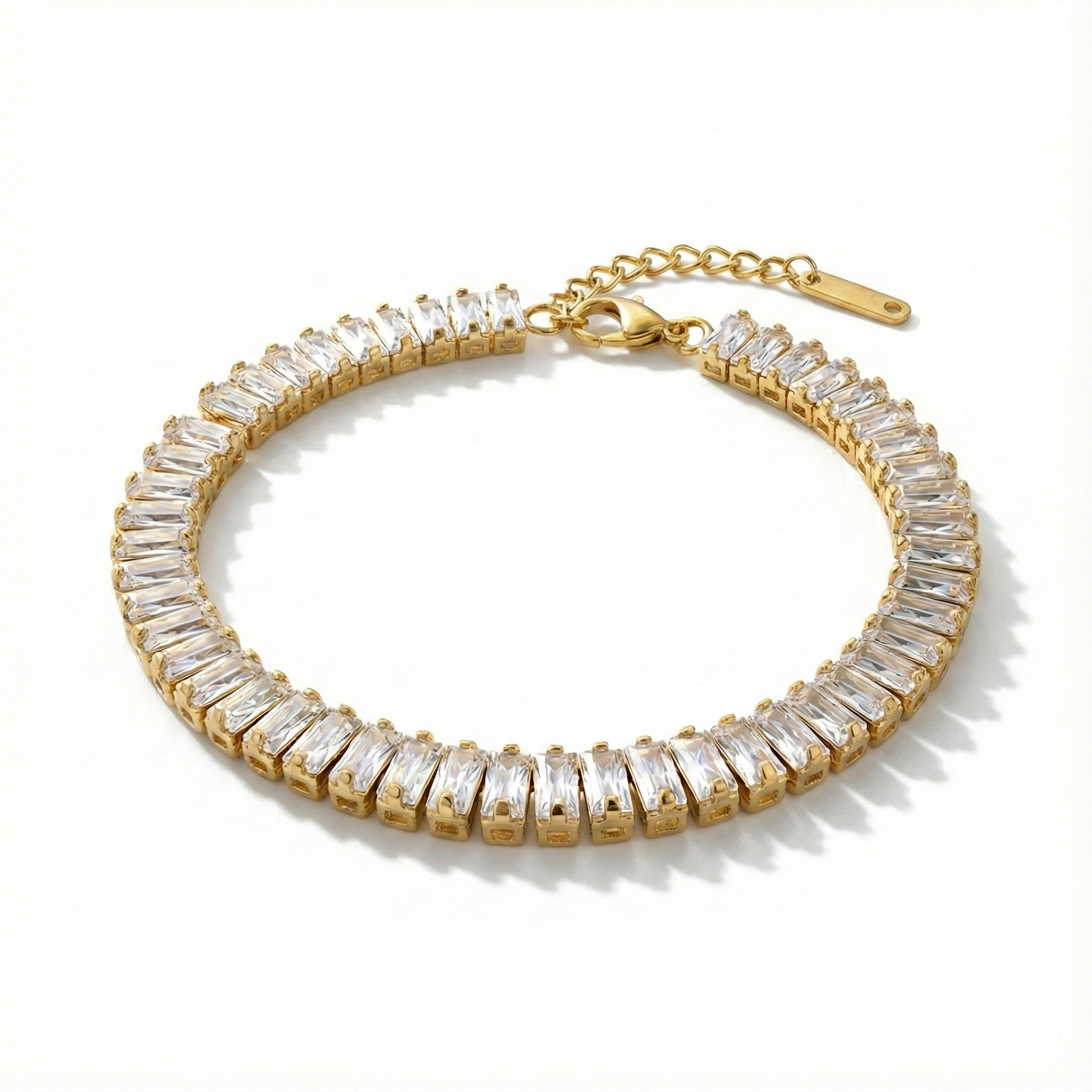 This classic tennis bracelet features a continuous row of precision-cut clear stones, set in a sleek gold-toned frame for a clean, high-shine look. Designed to sit smoothly on the wrist, it adds instant refinement to both everyday outfits and elevated occasions.