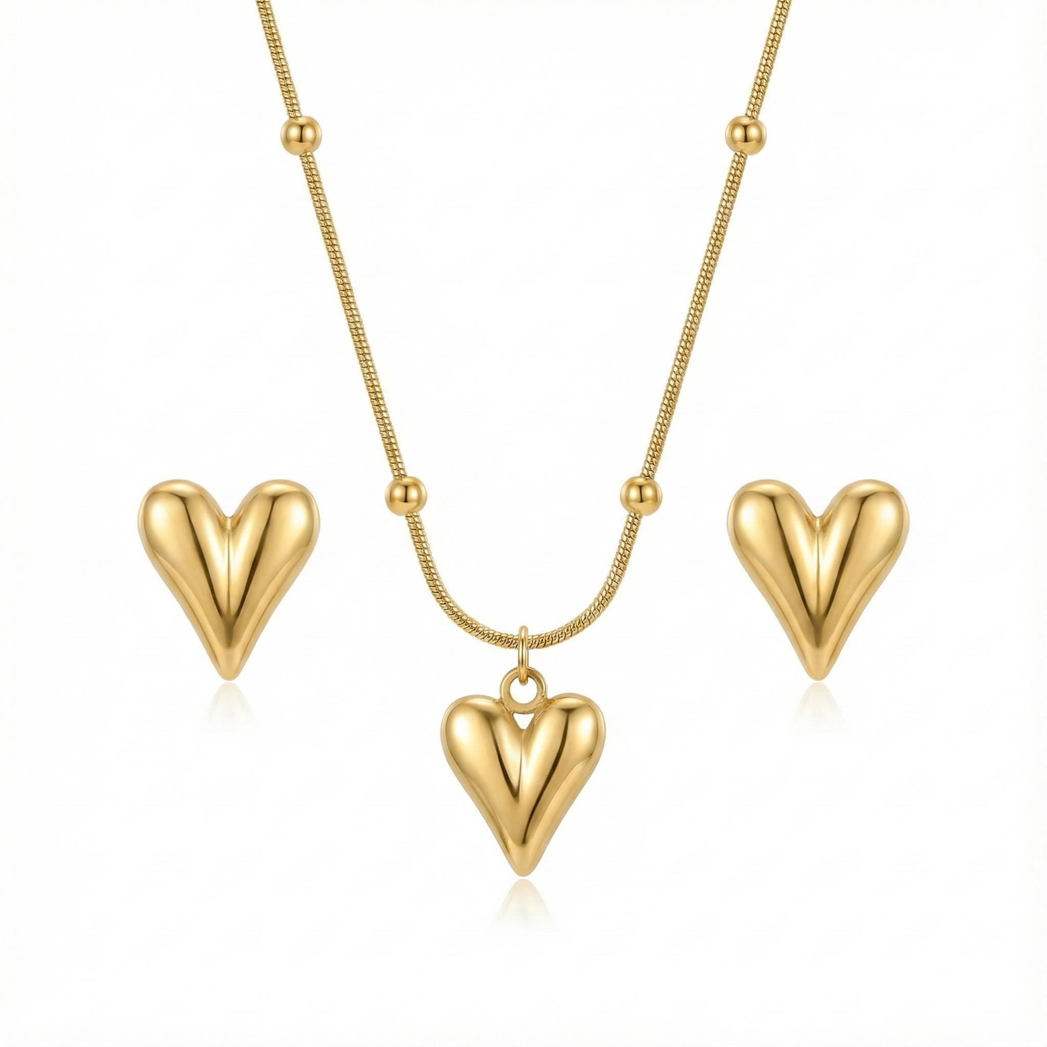 The necklace features a smooth heart pendant on a delicate gold chain with subtle bead details, paired with matching heart studs that sit neatly on the ear. Polished, minimal, and quietly statement-making.