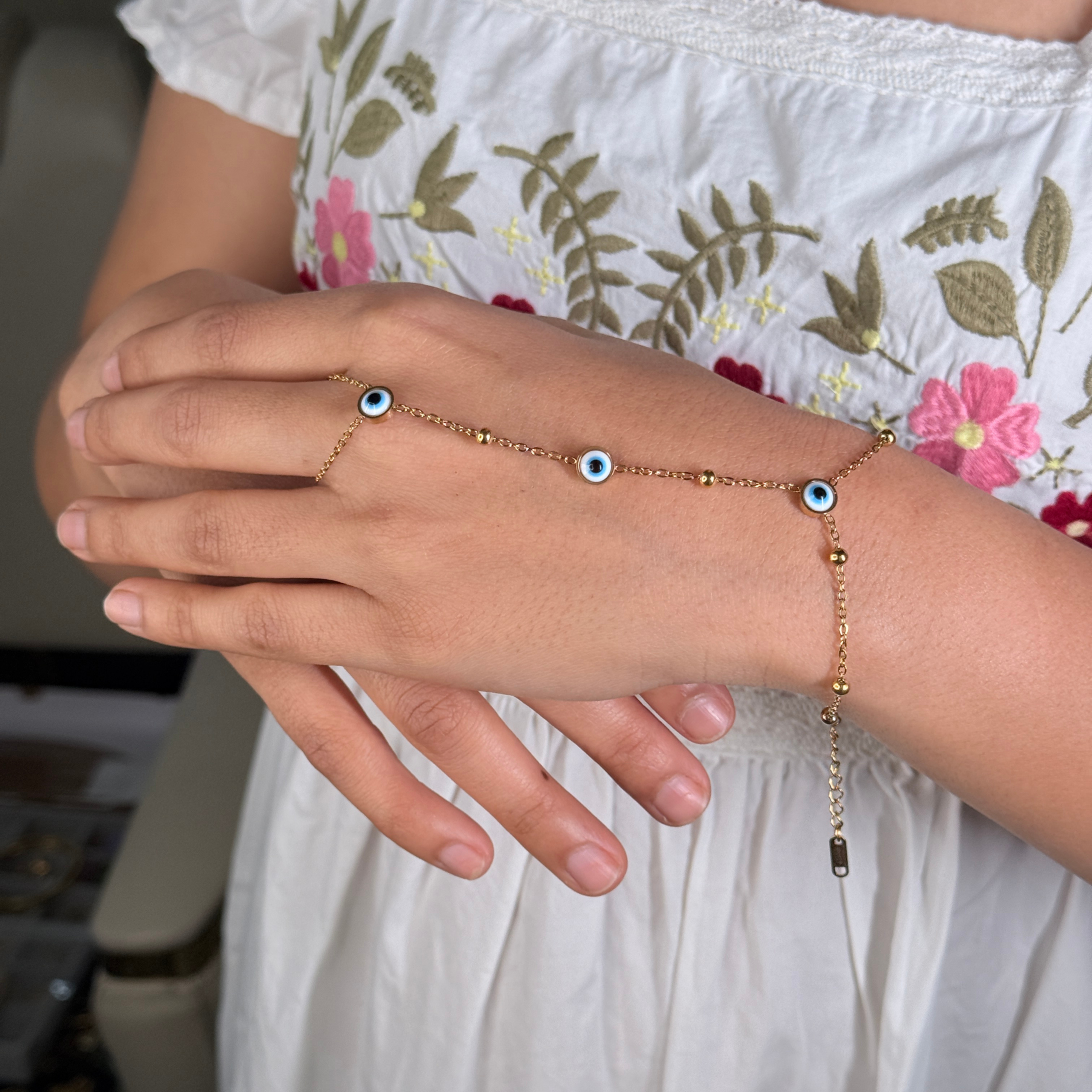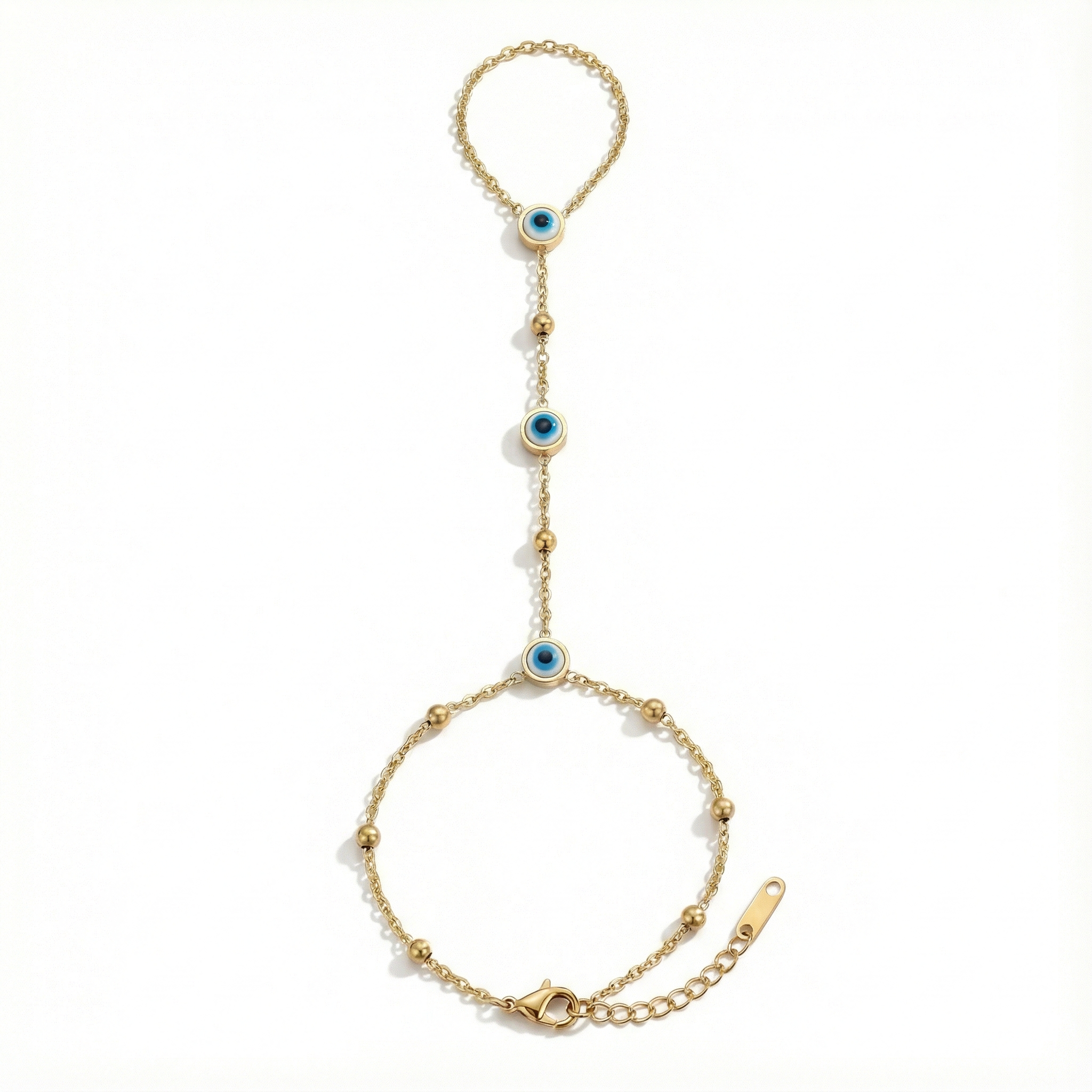 This evil eye hand chain brings together fine gold-tone links and bezel-set evil eye motifs placed along a clean vertical line, connecting an adjustable ring to a delicate bracelet. Thoughtfully minimal, the design keeps the focus on balance and details. Made to be worn close, as a quiet layer of protection and polish.
