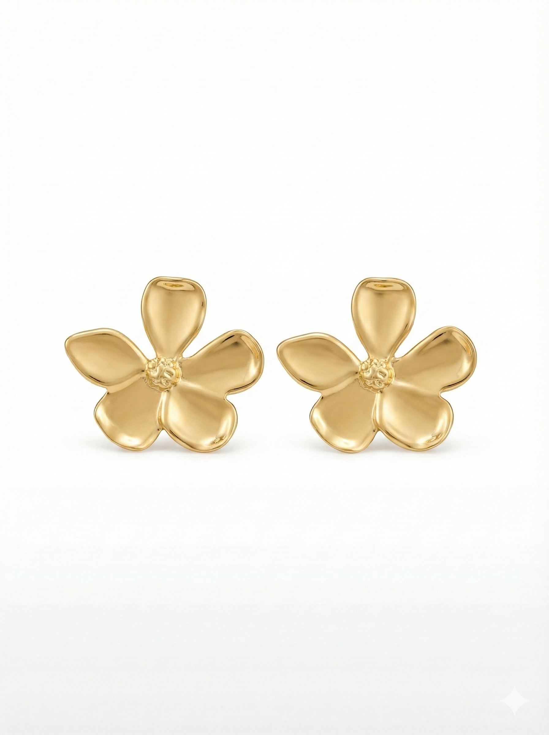 Large floral studs with a clean, sculpted form and high-shine finish. Designed to sit flat on the ear and stay balanced, they pair well with solid colours, open necklines, and minimal styling.