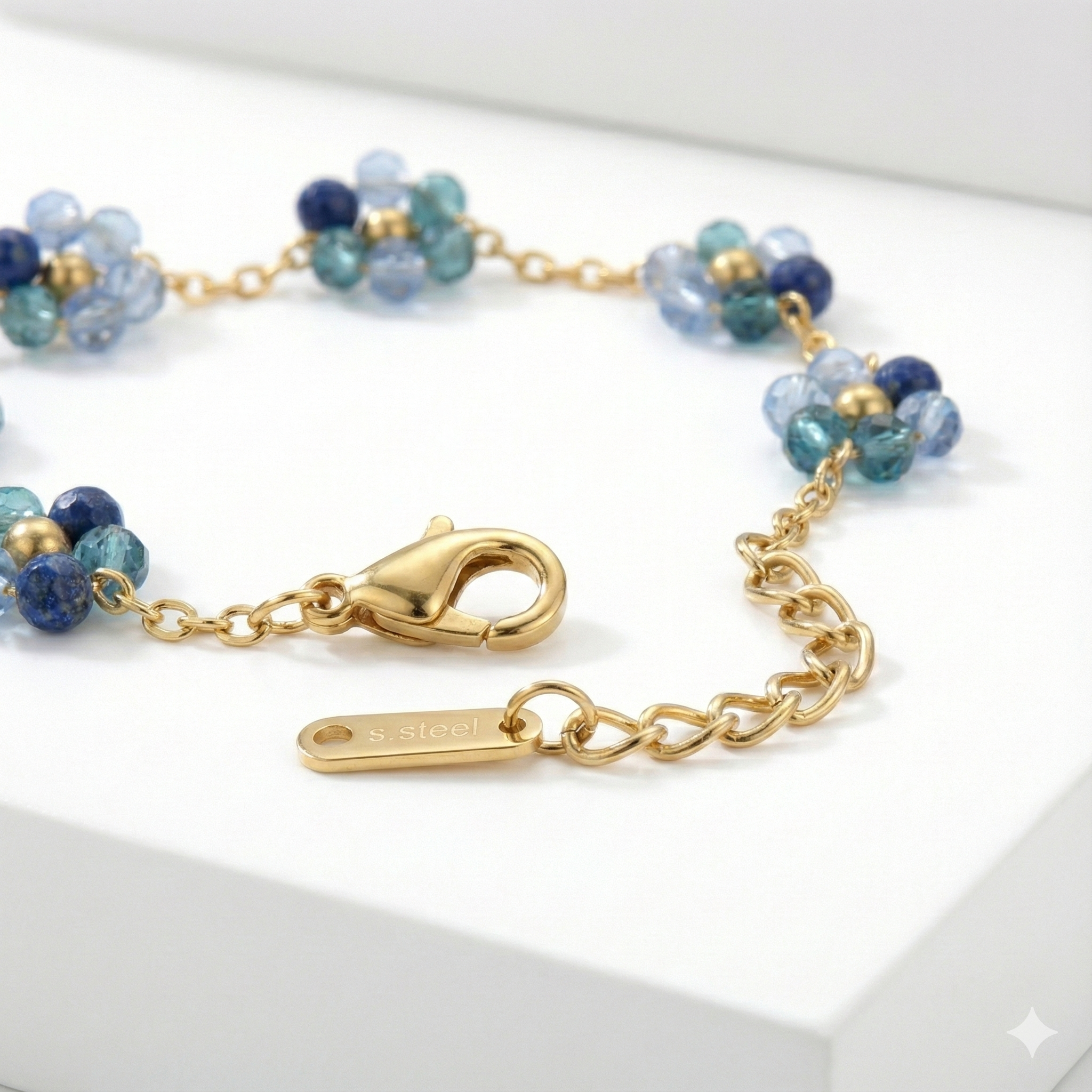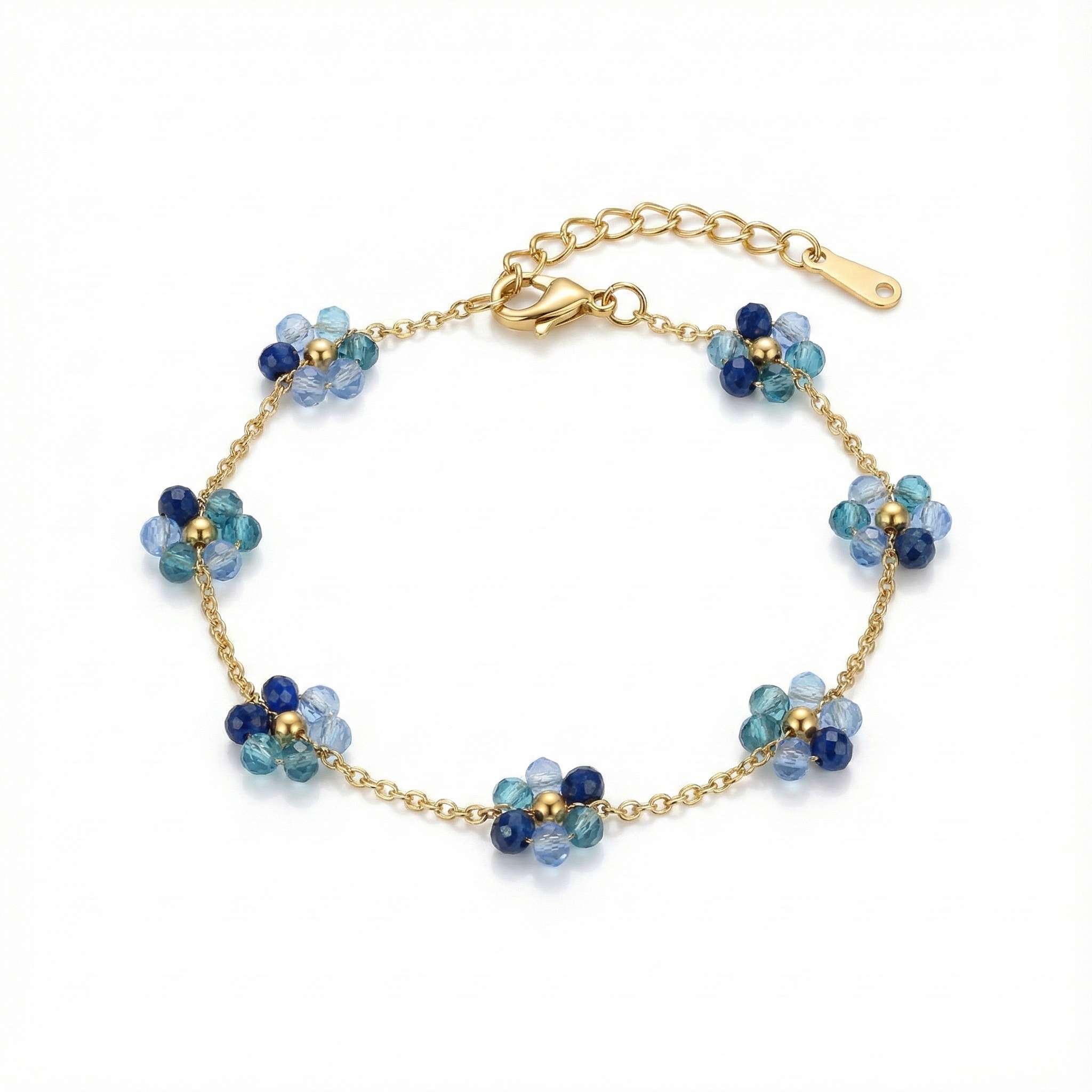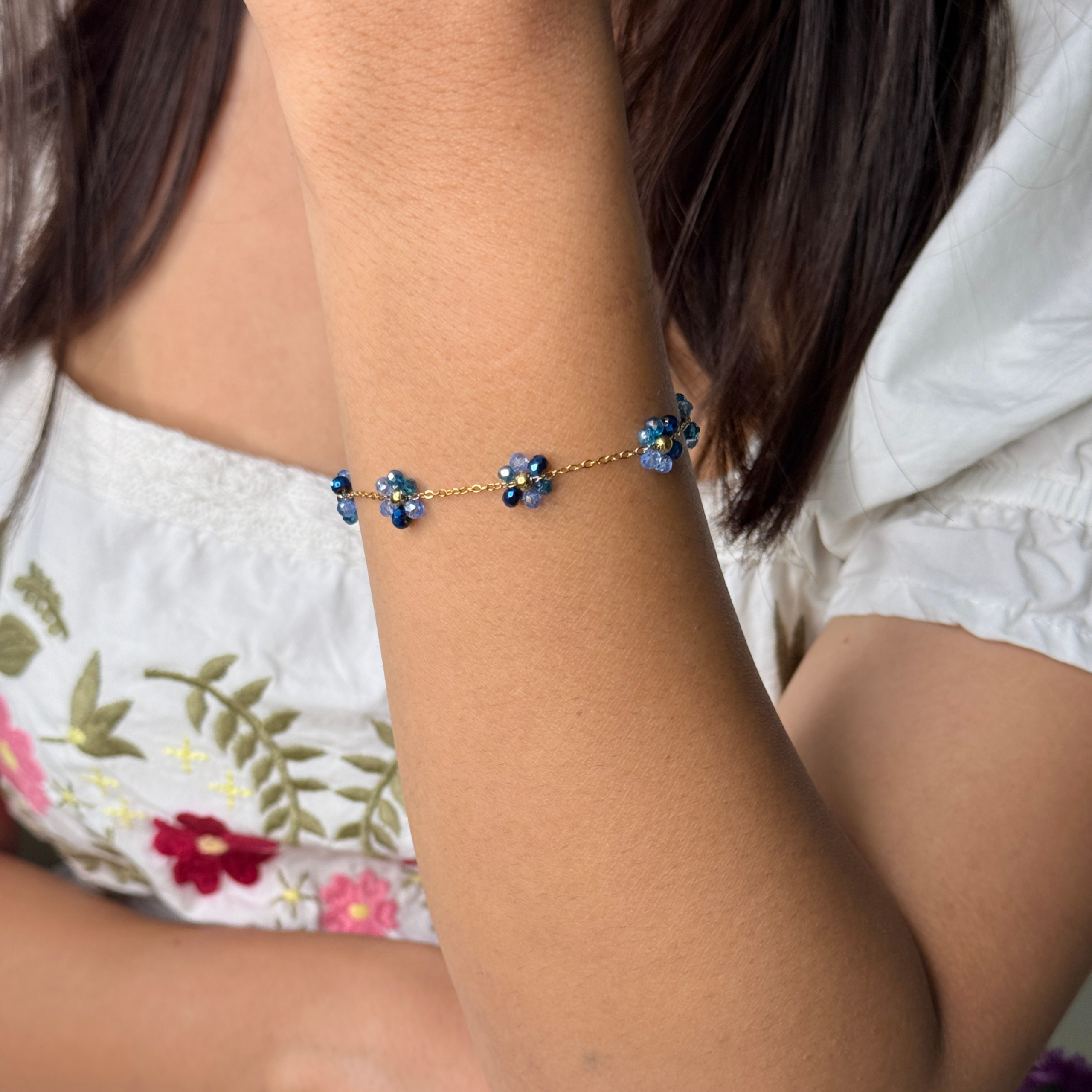 Tiny forget-me-not flowers come together in the prettiest shades of soft blue, strung delicately along a fine gold chain. Sweet, subtle, and full of charm, this bracelet feels like something you’d never want to take off.