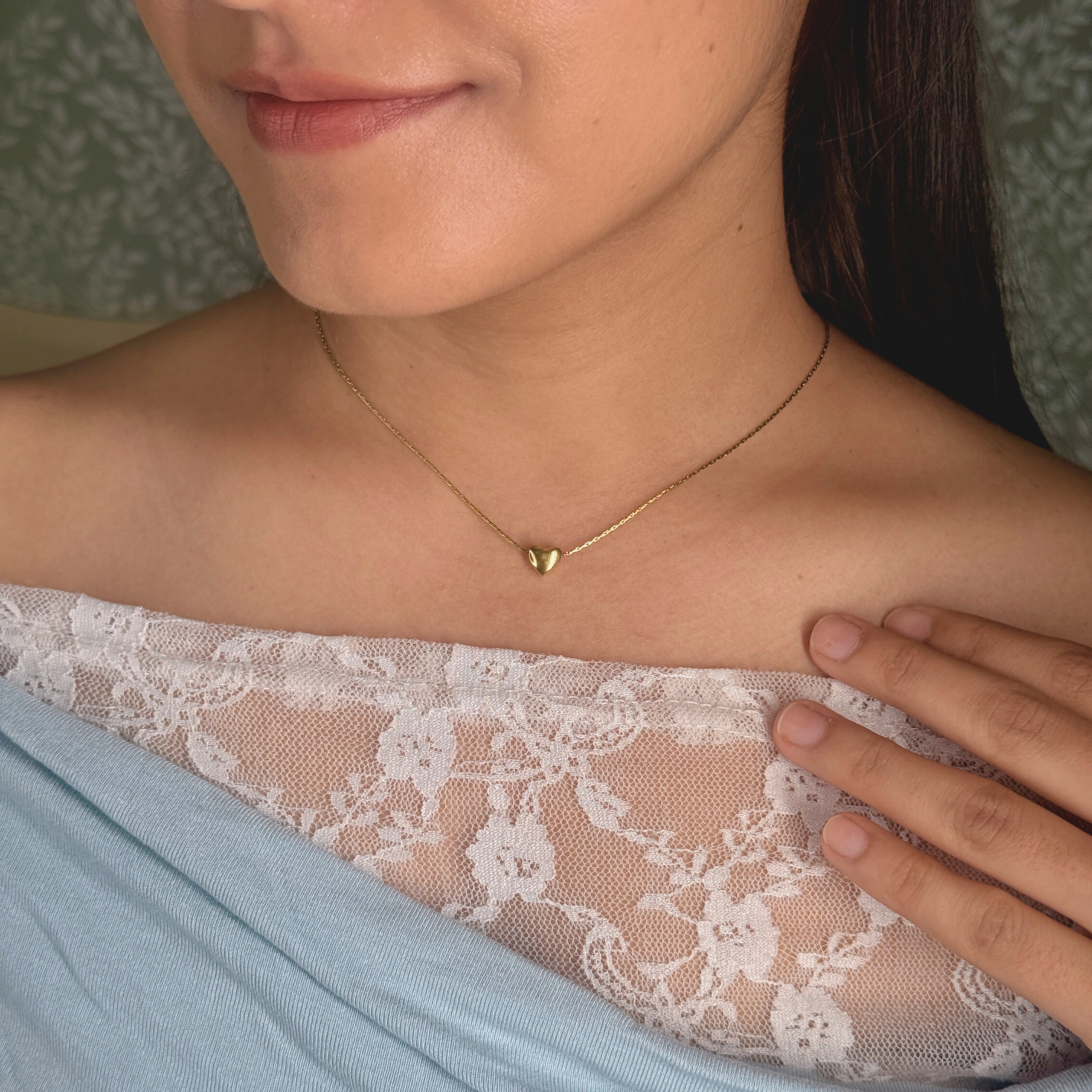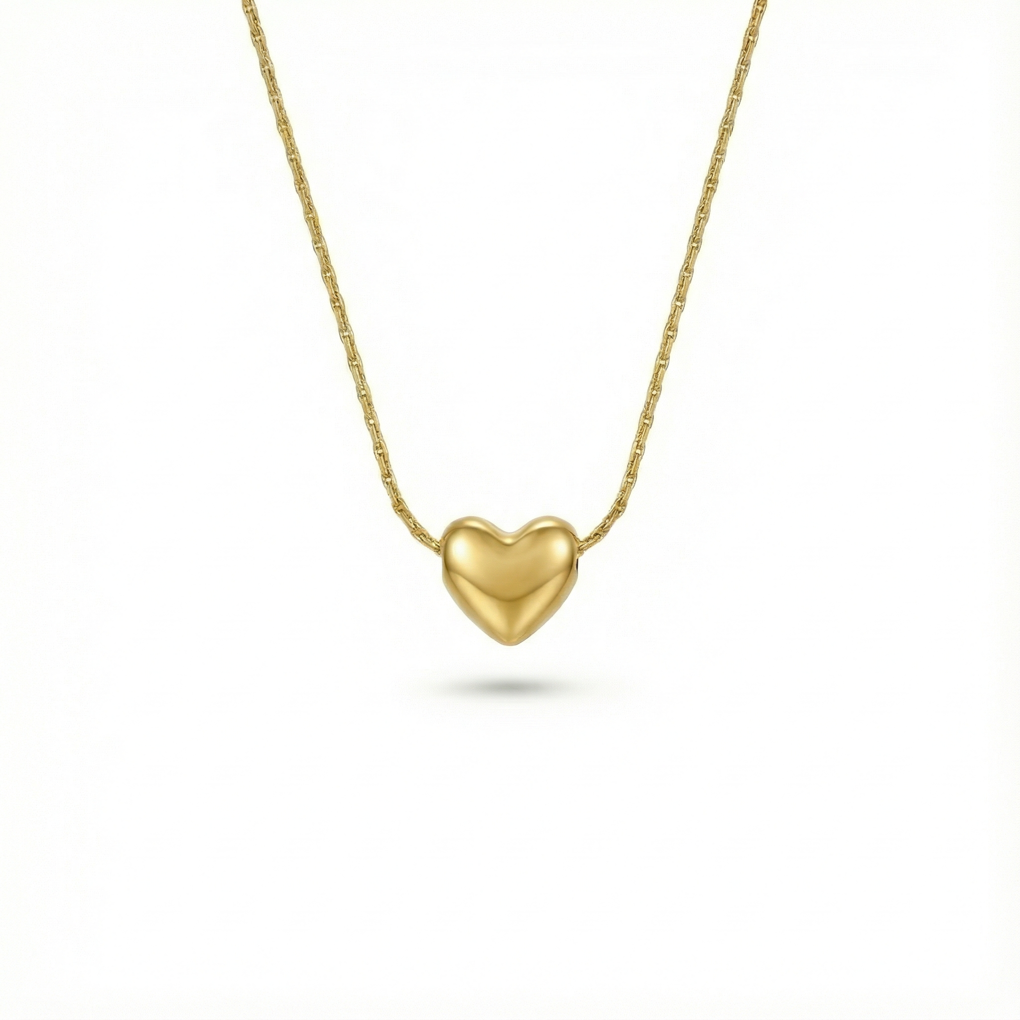 A petite gold heart pendant suspended on a fine, sleek chain, designed for understated everyday elegance. Minimal yet expressive, this mini heart adds a soft romantic touch without overpowering—perfect for layering or wearing solo as a subtle signature piece.