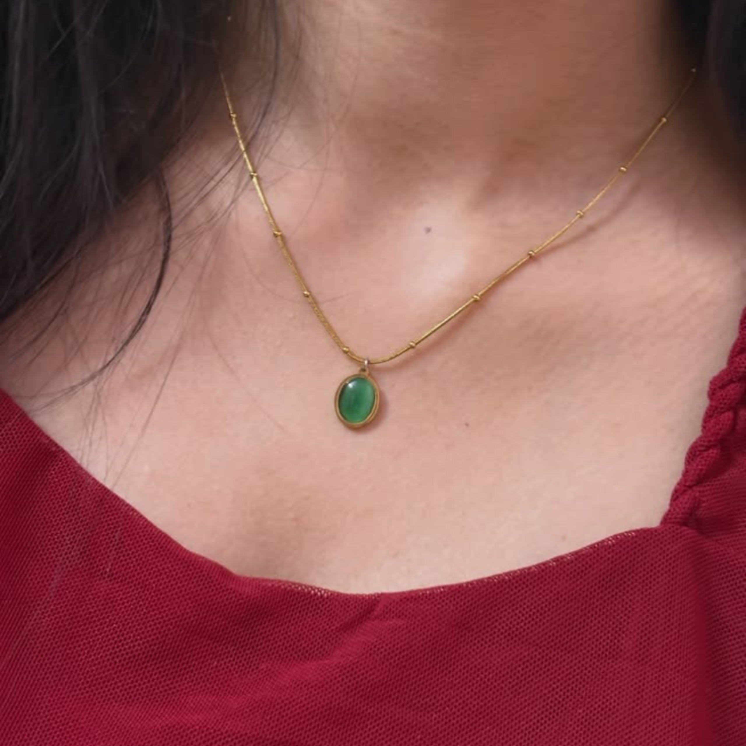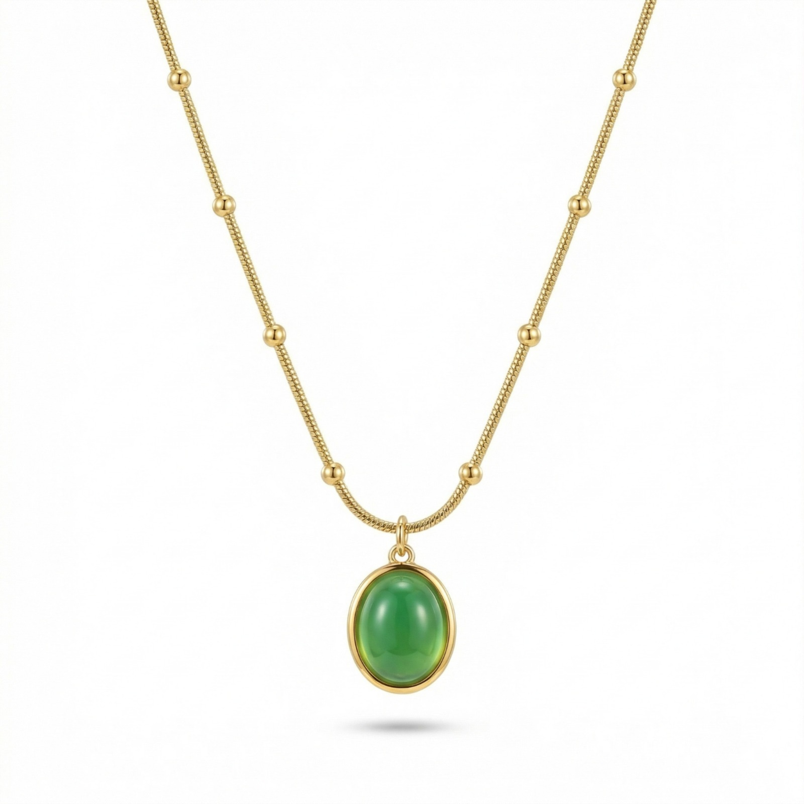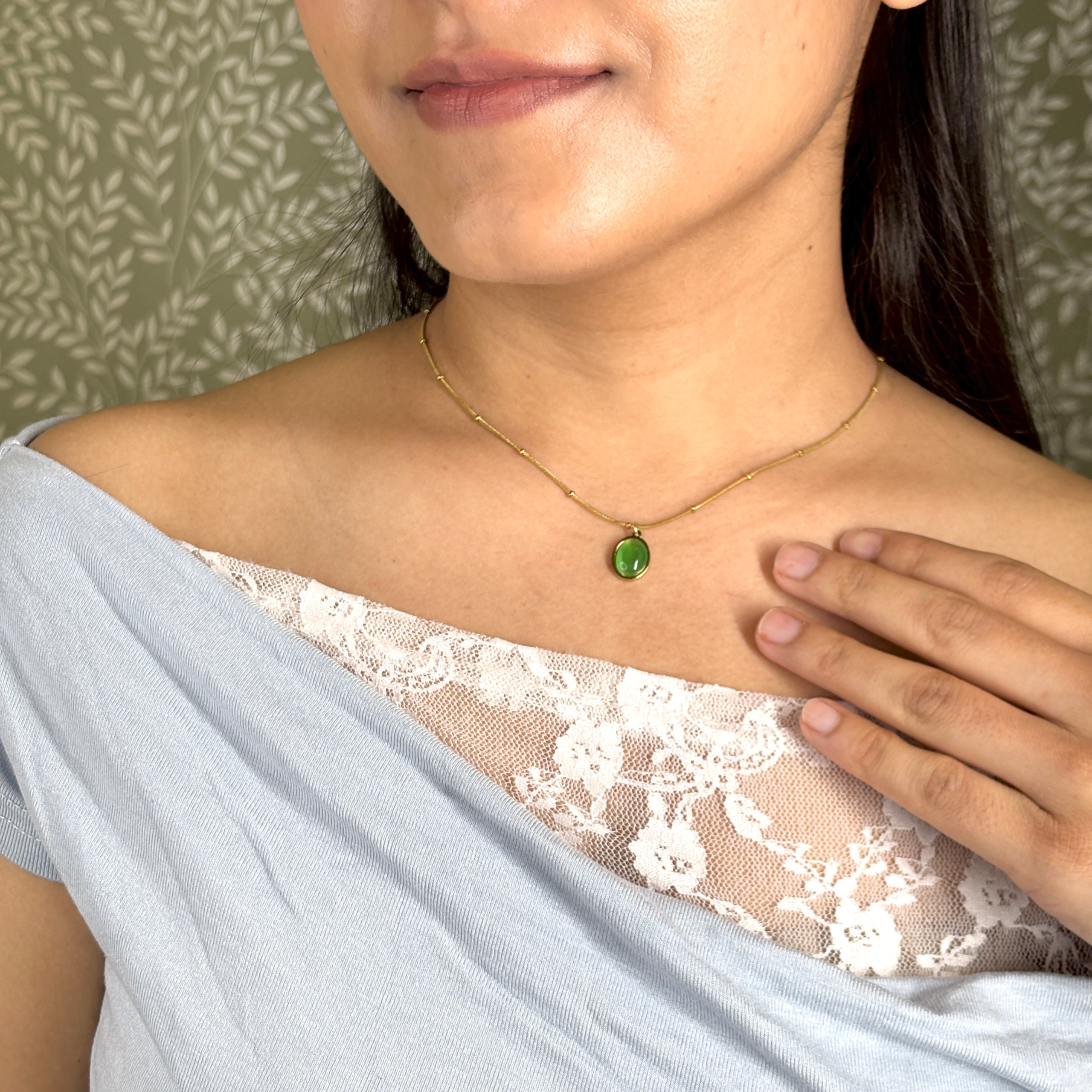 A smooth olive-toned pendant on a sleek beaded chain. The rounded stone adds a soft hint of colour, while the fine beads keep the look light and easy. An everyday piece that layers well.