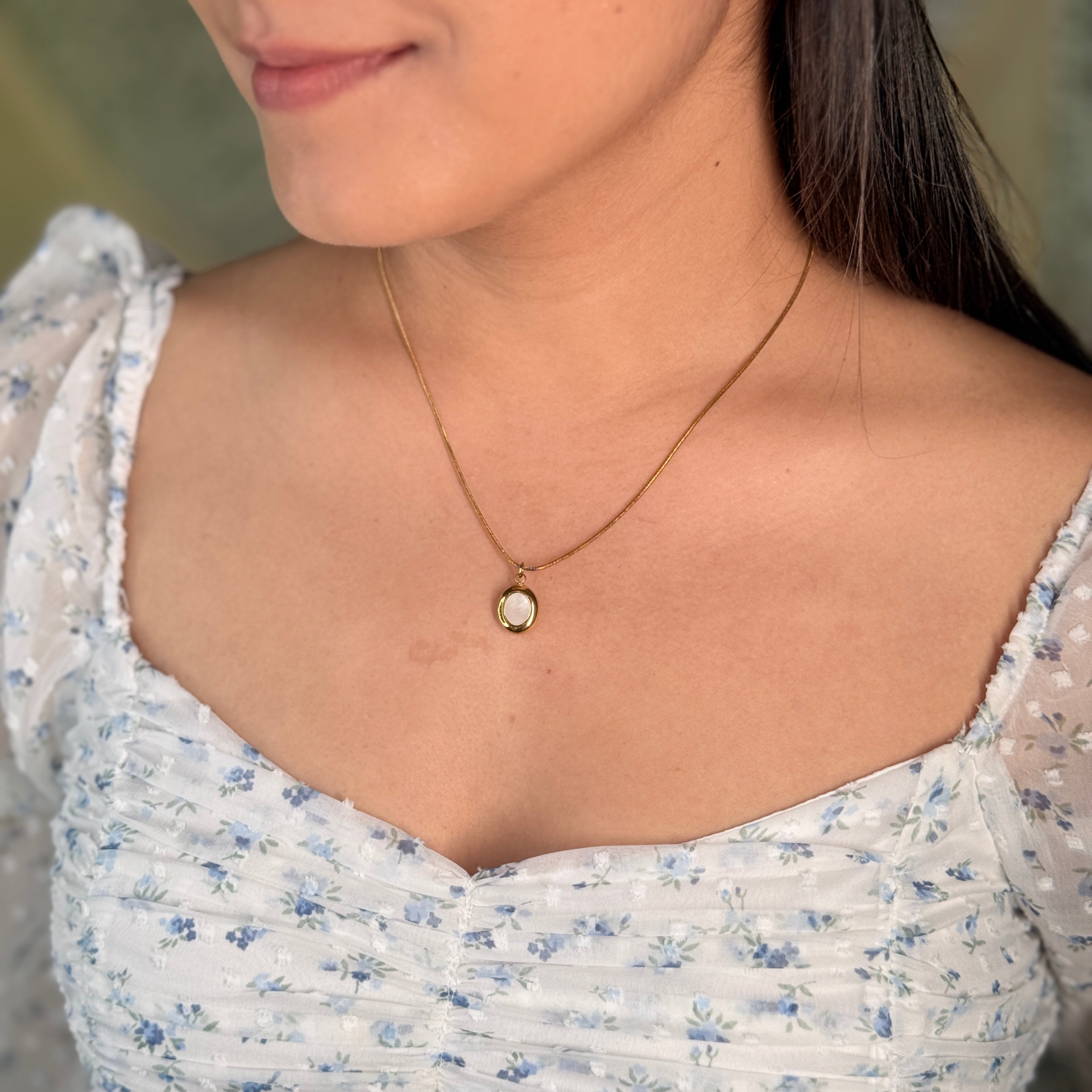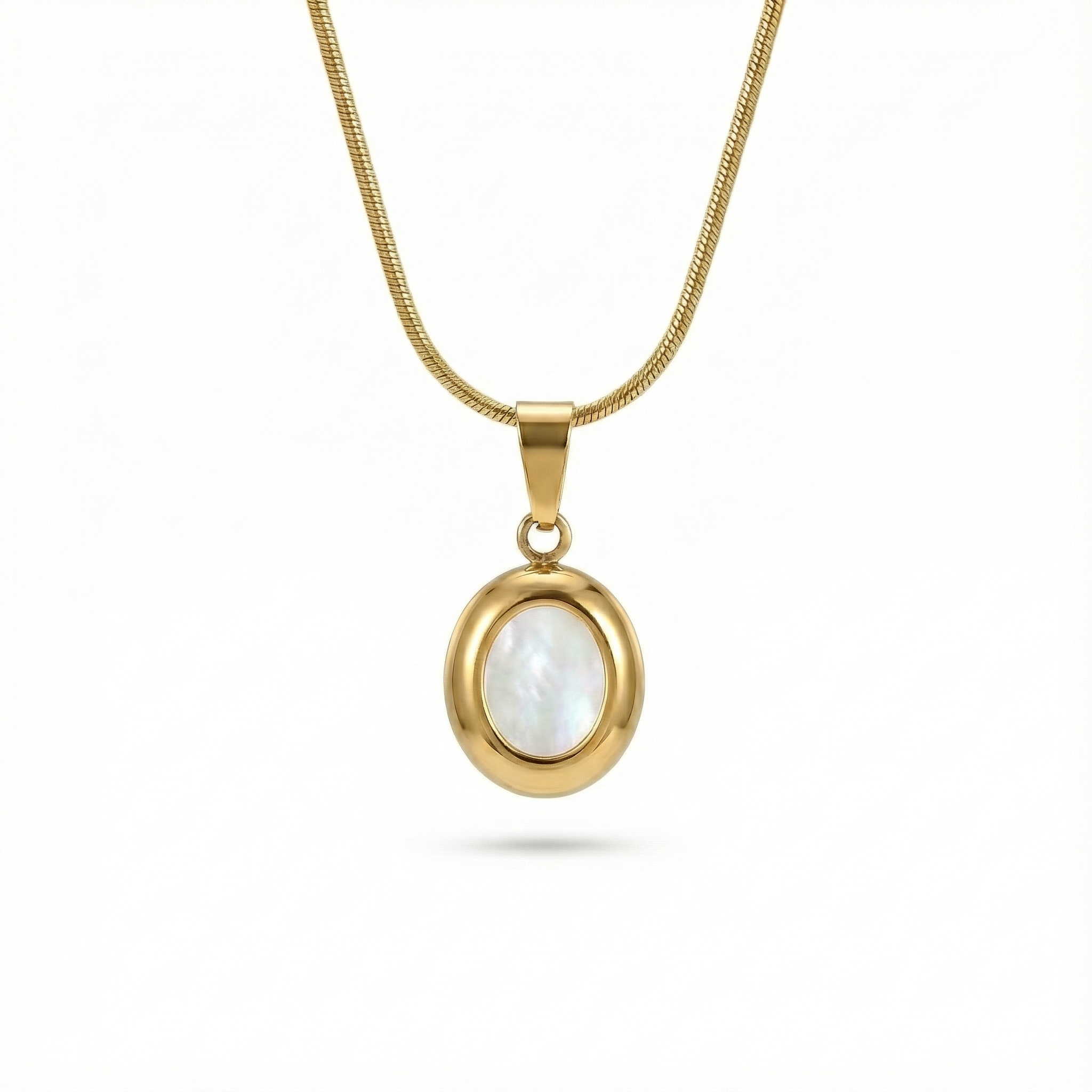A timeless oval-pearl pendant on a sleek minimal chain. The iridescent stone adds a soft glow to everyday outfits. Waterproof, anti-tarnish, and hypoallergenic (no green skin) stainless steel.