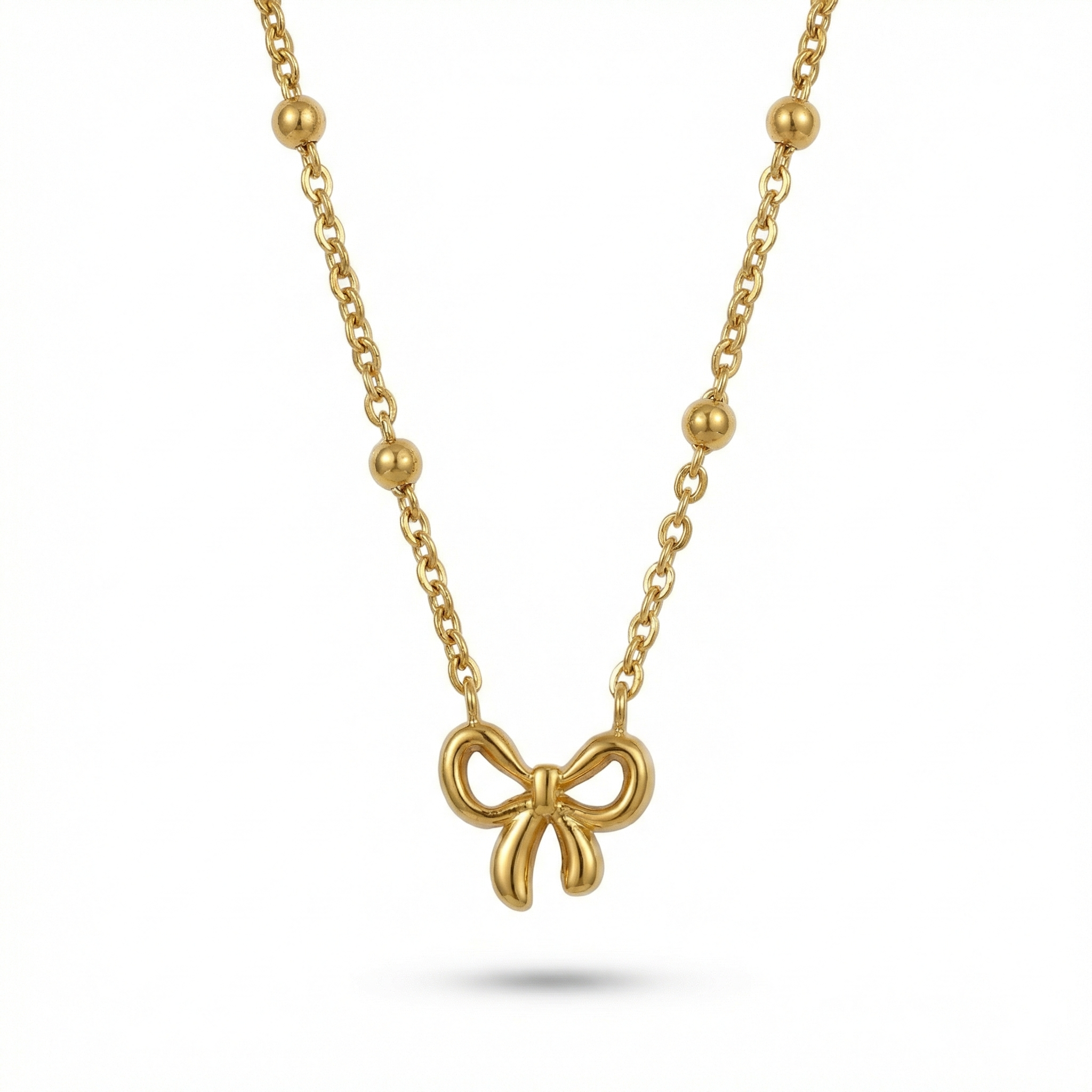 A petite bow pendant on a large beaded chain. Soft curves keep the bow light and playful, while the chunky beads add a little presence without feeling heavy. Easy to wear on its own or layered.