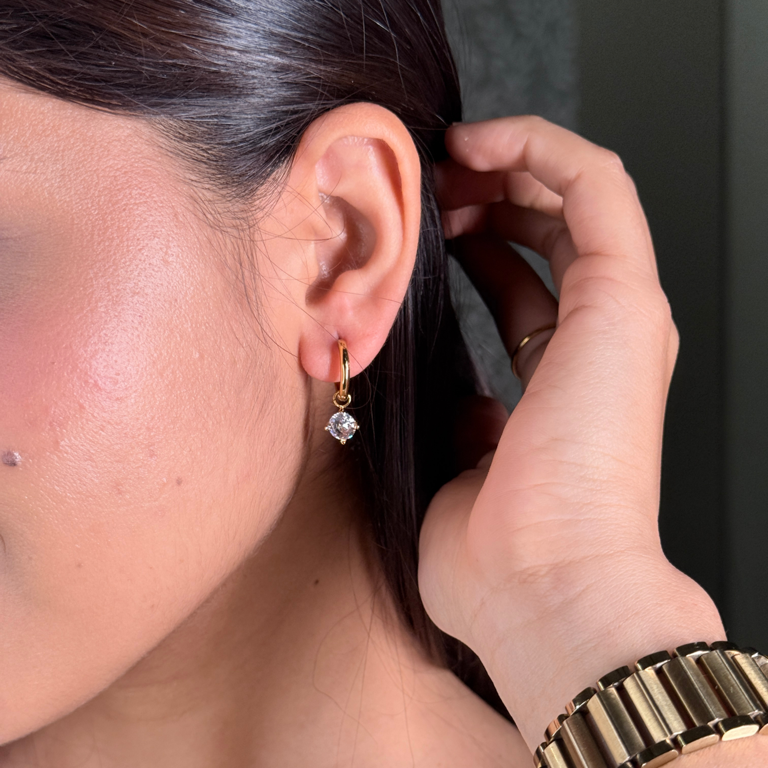 A delicate huggie hoop with a round solitaire drop that feels effortless yet styled. Clean lines, a soft shine, and that understated detail that makes your whole look feel put together — perfect for minimal outfits, low buns, and neutral fits.