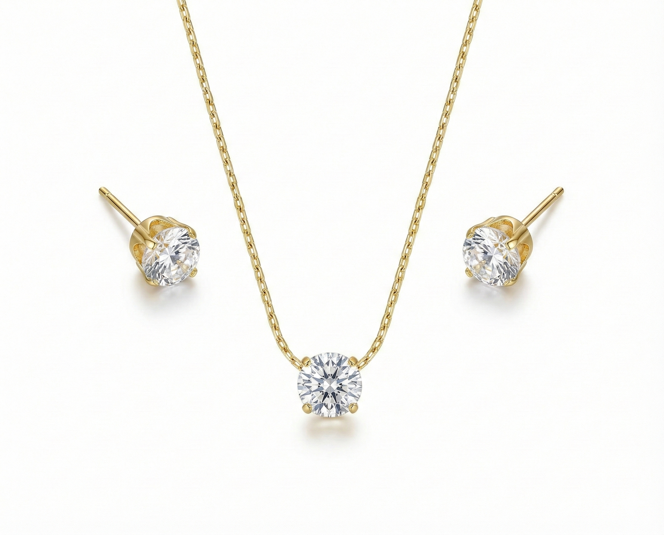 The necklace features a single round-cut stone set in a sleek gold bezel, resting lightly on a fine chain. Paired with matching solitaire studs, the set feels balanced, polished, and quietly elevated.
