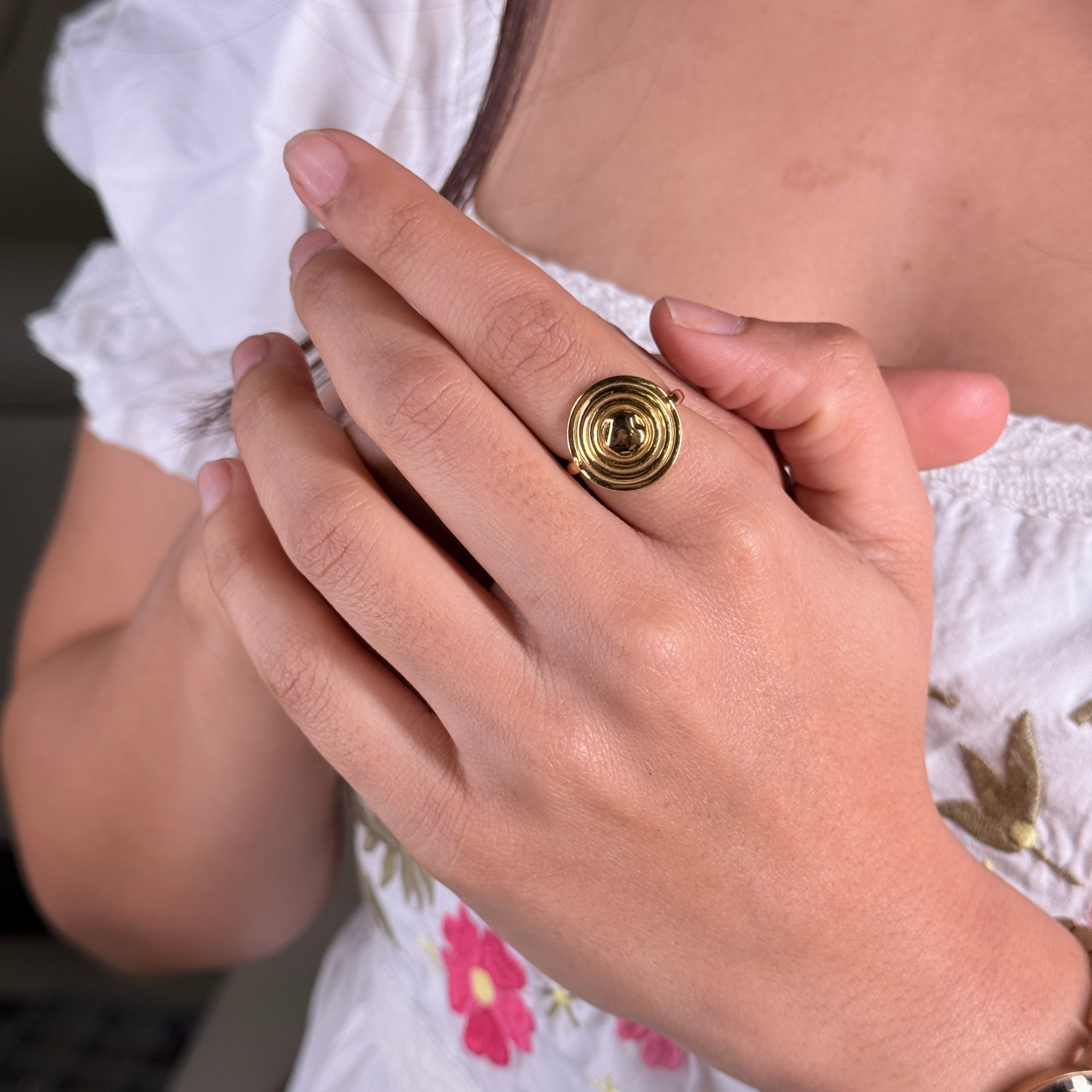 This spiral ring features soft concentric curves that flow inward, representing growth, continuity, and the beauty of growing at your own pace. Perfect for free-spirited styling, layered boho looks, or worn solo as a subtle reminder to keep moving forward.