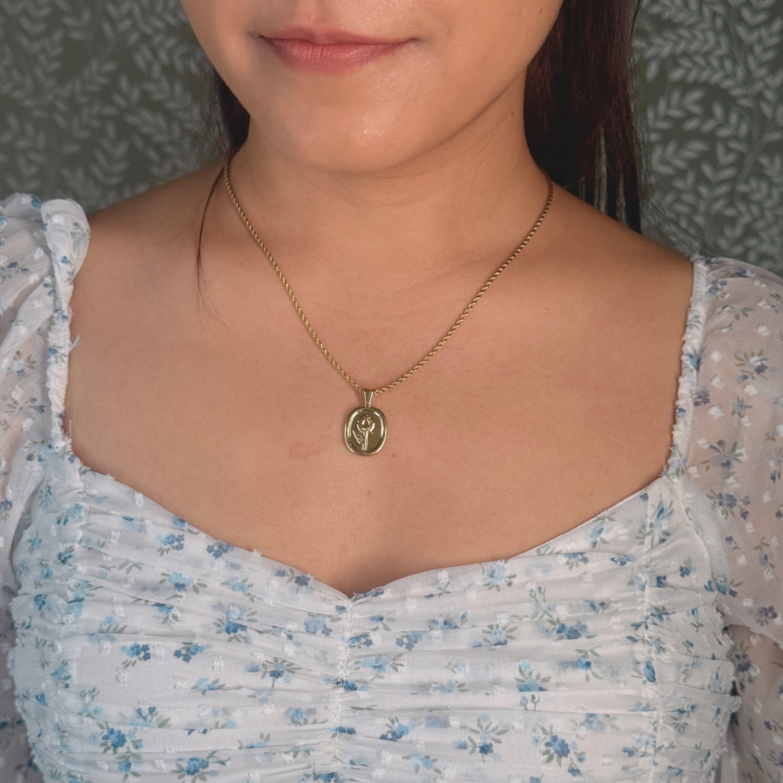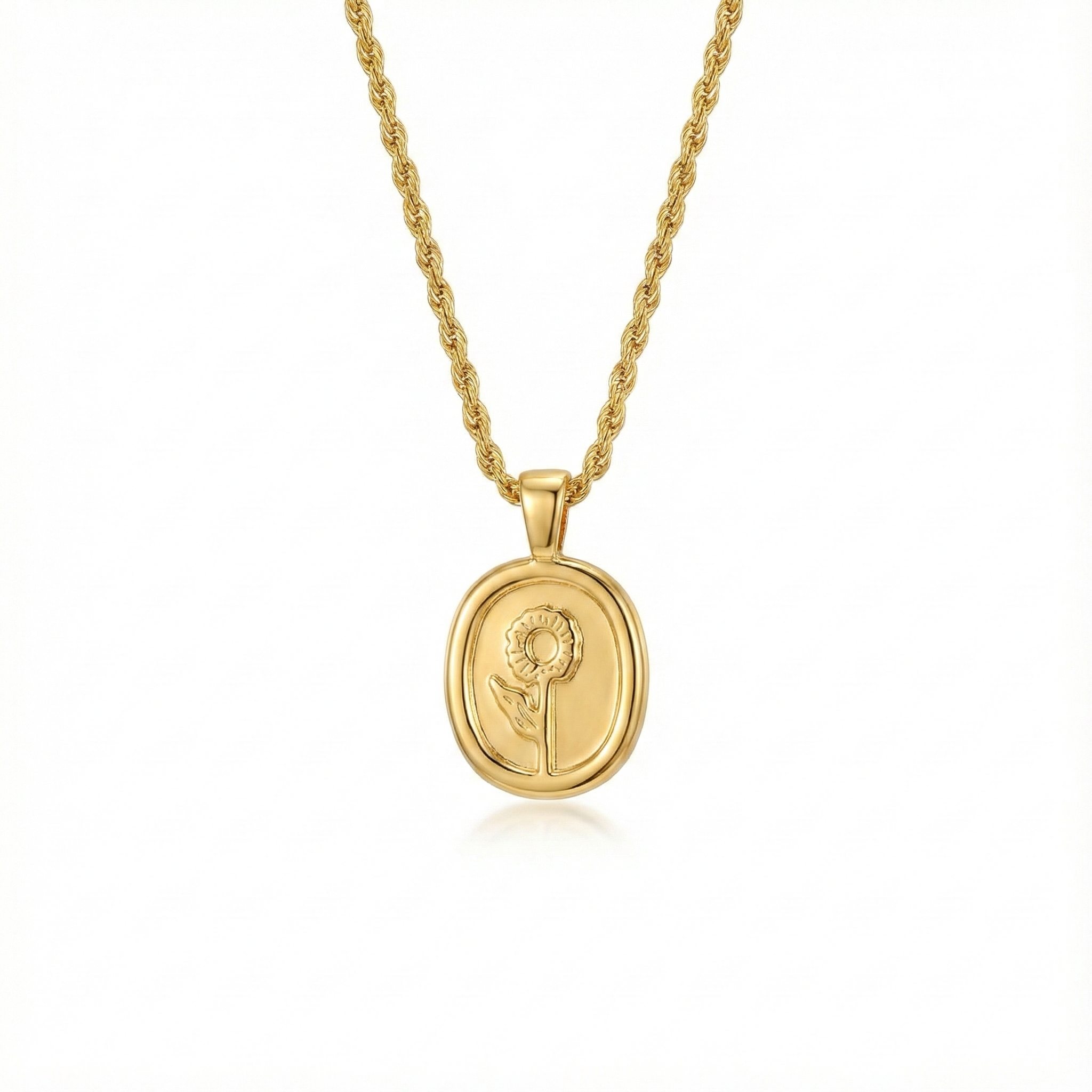 A sunflower pendant with soft warm detailing that feels like wearing a tiny hint of sunshine. The rope chain adds a bit of texture without making the piece loud. Waterproof, anti tarnish, and hypoallergenic (no green skin).