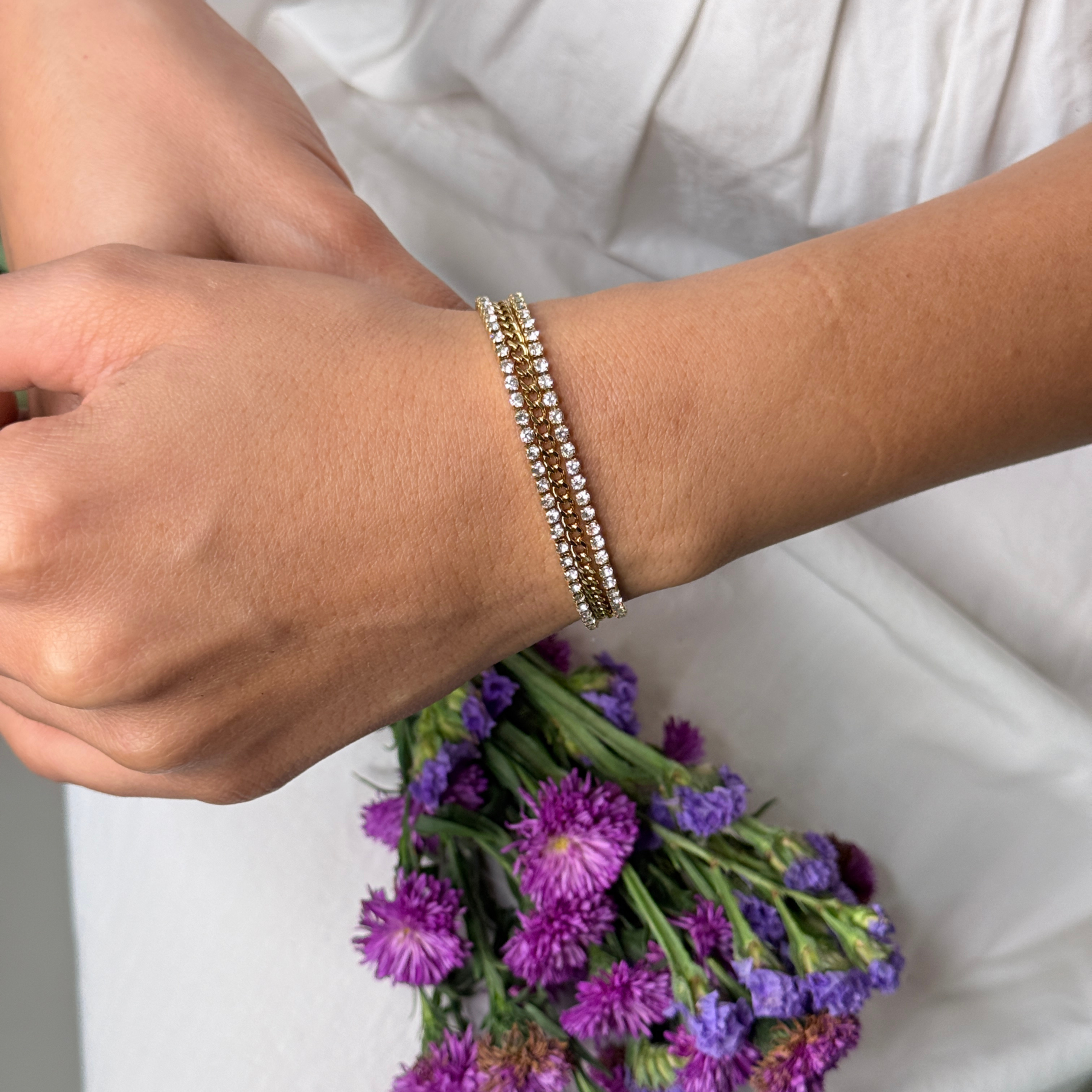 Three links, one statement. This trinity bracelet combines two fine tennis strands with a classic link chain, creating contrast that works with everything — from everyday fits to dressed-up looks. Wear it solo. It doesn’t need company.