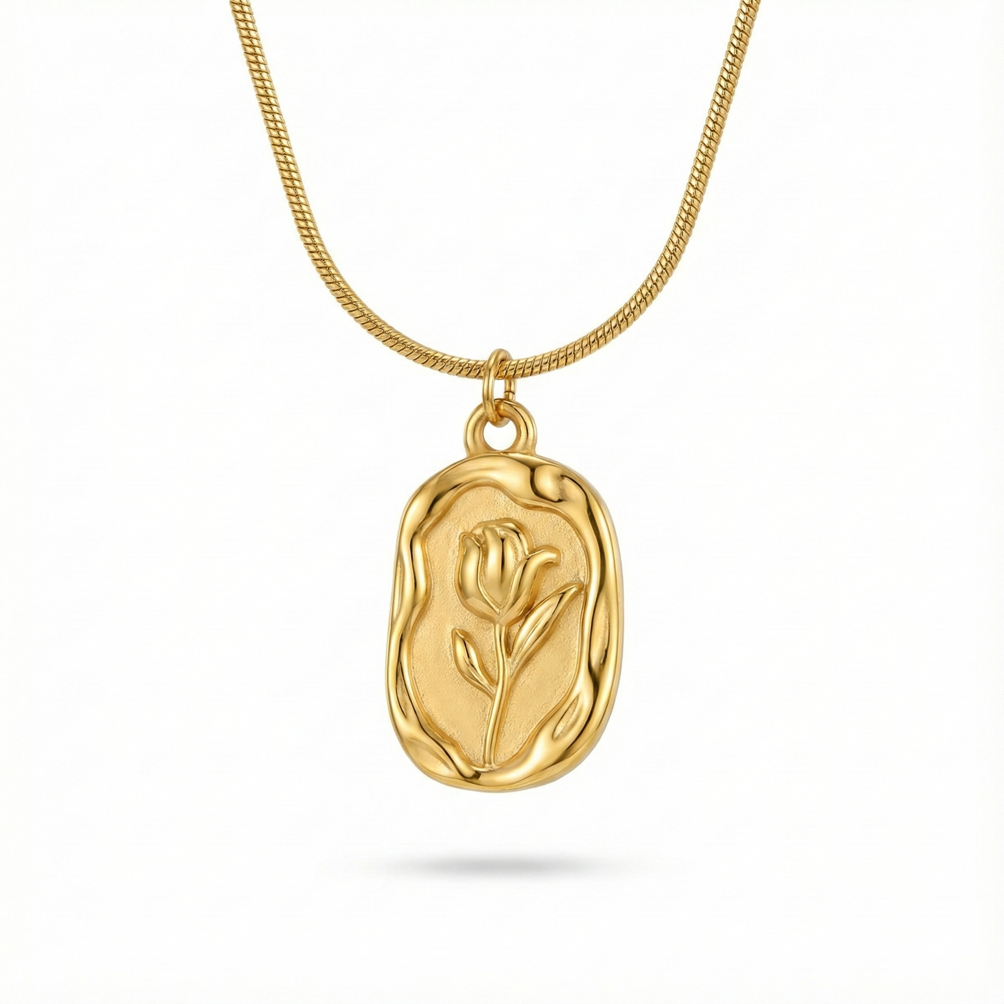 A soft floral staple for anyone who loves simple meaningful pieces. A tulip pressed into a smooth golden charm, paired with a sleek snake chain for a clean everyday look. Waterproof, anti tarnish, and hypoallergenic.